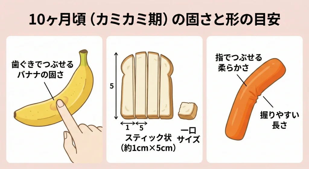 生後10ヶ月の赤ちゃんは、口腔機能が大きく発達する時期にあります。これまでは舌で上あごに押し付けて潰していたものが、この時期になると「歯ぐきで潰して食べる」という高度な動きができるようになってきます。そこで重要になるのが、食材の固さの調整です。よく言われる目安が「完熟したバナナくらいの固さ」。これは指で軽く押したときにスッと潰れる程度の柔らかさを指します。