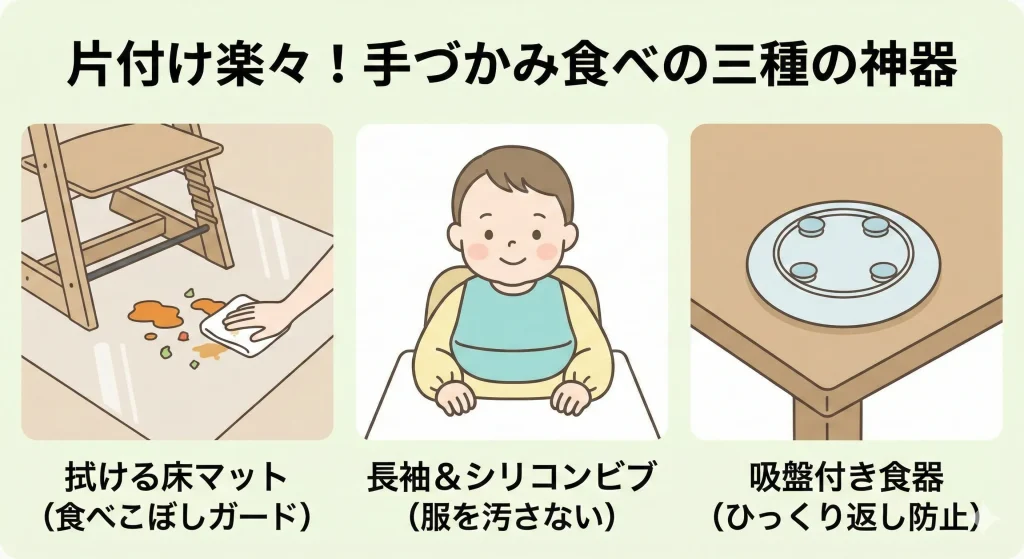 次にエプロンですが、10ヶ月の手づかみ期は、首から下げるタイプでは不十分です。腕を振り回すので、袖口までカバーできる「長袖スモック型」を強くおすすめします。さらに、そのスモックの上から「ポケット付きのシリコンビブ」をダブルで装着すれば、鉄壁の守りになります。服の袖が汚れなければ、食後の着替えという重労働から解放されます。最近では、100円ショップでも優秀なシートが売られていますし、楽天やAmazonのランキング上位にある「ひっくり返らない食器(吸盤付き)」を併用すれば、テーブルの上の大惨事も未然に防げます。便利な道具に頼ることは、手抜きではなく「賢い選択」ですよ。