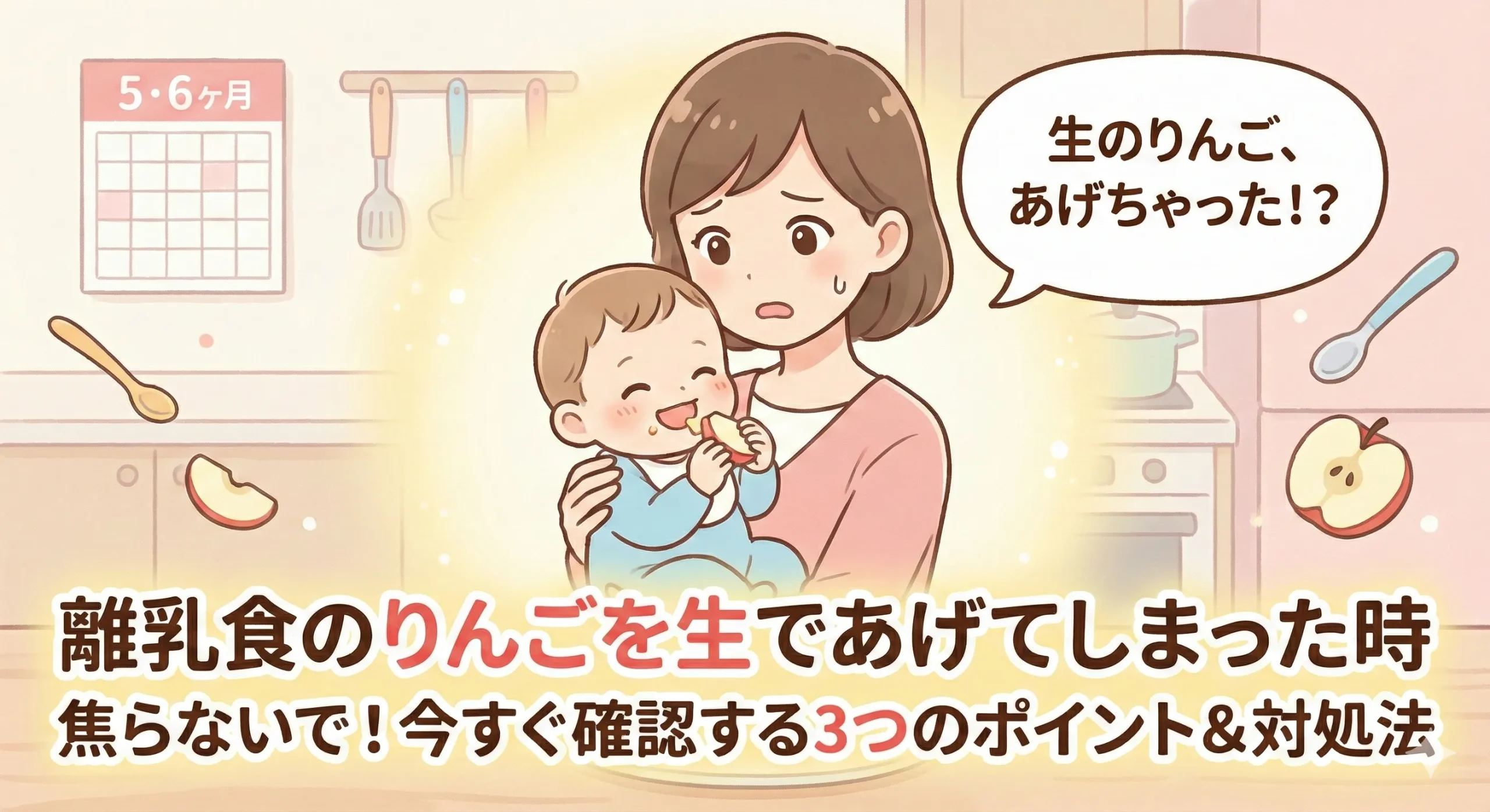 離乳食を進めていると、毎日が新しいことの連続で、時には「うっかり」ミスをしてしまうこともありますよね。特に、離乳食初期から使える身近な果物であるりんごは、つい「少しなら大丈夫かな?」と加熱せずに与えてしまったり、兄弟が食べているものを赤ちゃんが欲しがって、つい一口あげてしまったりすることもあるかもしれません。離乳食 りんご 生であげてしまった時、5ヶ月や6ヶ月の赤ちゃんのママやパパが真っ先に感じるのは、強い焦りと不安ではないでしょうか。舐めただけなら平気なのか、アレルギー反応が出てしまうのではないか、あるいは喉に詰まらせて窒息してしまうのではないかと、心配でたまらなくなりますよね。この記事では、そんな時に今すぐ確認すべきポイントや、後から出てくるかもしれない下痢や嘔吐といった体調の変化、そして今後のための安全な調理法を詳しく解説します。この記事を読むことで、あなたの不安が少しでも解消され、明日からの離乳食作りがもっと安心できるものになるかなと思います。私と一緒に、まずは落ち着いて今の状況を一つずつ確認していきましょう。