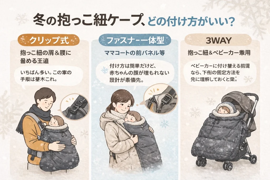 ③ 抱っこ紐ケープ 冬の付け方(最短でズレない手順)