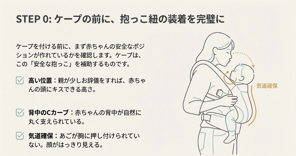 抱っこ紐ケープ(冬)の付け方は「上→下→密着→顔まわり確認」の順で固定すれば失敗しません。