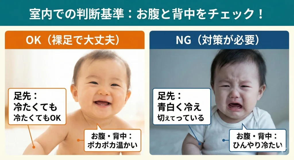 | チェック項目 | 正常な状態(裸足でOK) | 寒い・不調のサイン(対策が必要) |