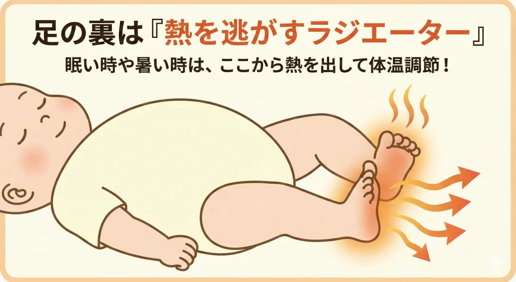 人間は脳や内臓の温度(深部体温)を一定に保つ必要がありますが、赤ちゃんは汗腺の発達が未熟で、大人ほど全身で効率よく体温調節ができません。そこで、面積が小さく血管が密集している「手掌(手のひら)」と「足底(足の裏)」から熱を逃がすことで、体温が上がりすぎるのを防いでいるんです。