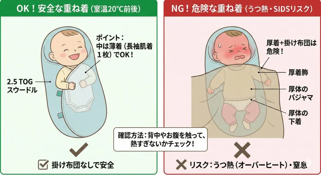 - 厚着による「うつ熱」やSIDSのリスクを回避する安全な重ね着術
