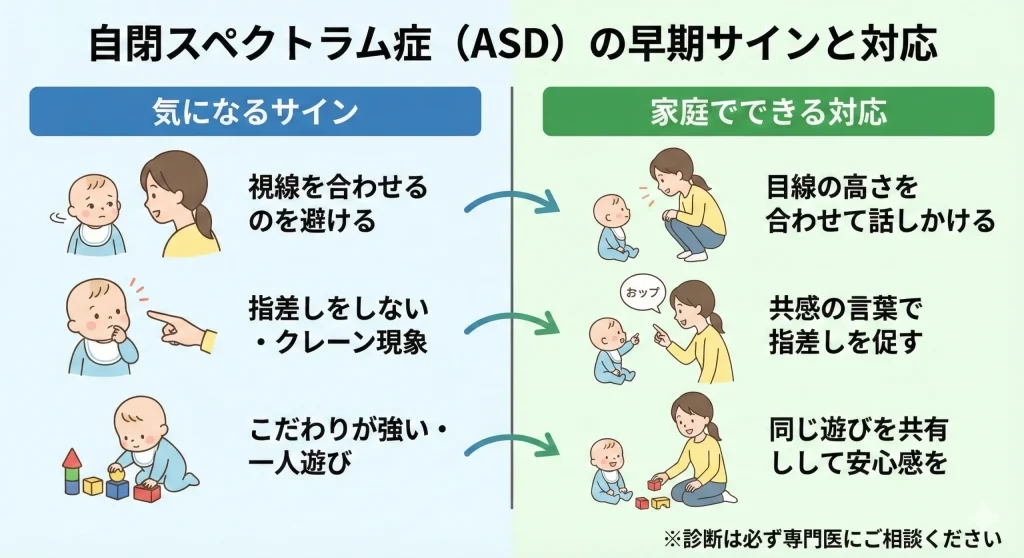 - 自閉スペクトラム症(ASD)の早期サインとされる具体的な行動の特徴