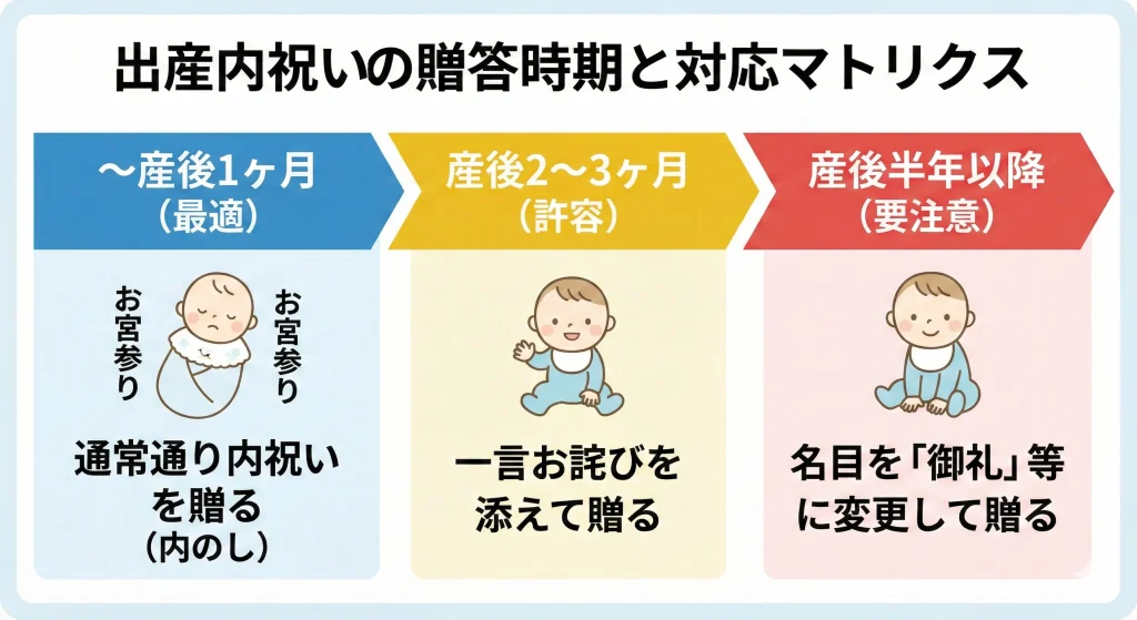 | 産後2〜3ヶ月 | ◯ 許容 | 一言お詫びを添えて「出産内祝」。 |