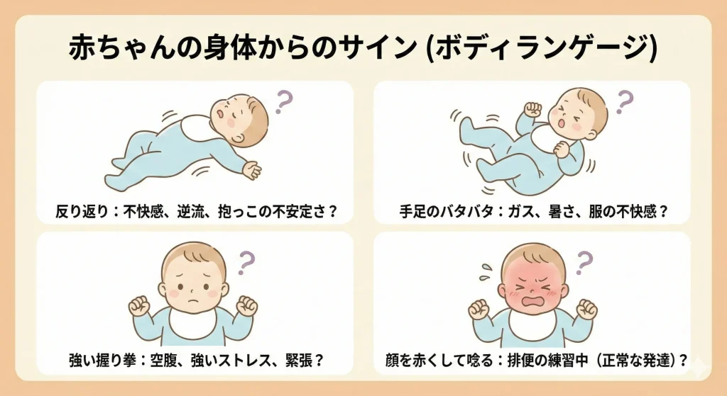 | 親指を入れた握り拳 | 強いストレス・空腹 | アドレナリンが出ている証拠。まずは落ち着かせてから授乳を試みて。 |