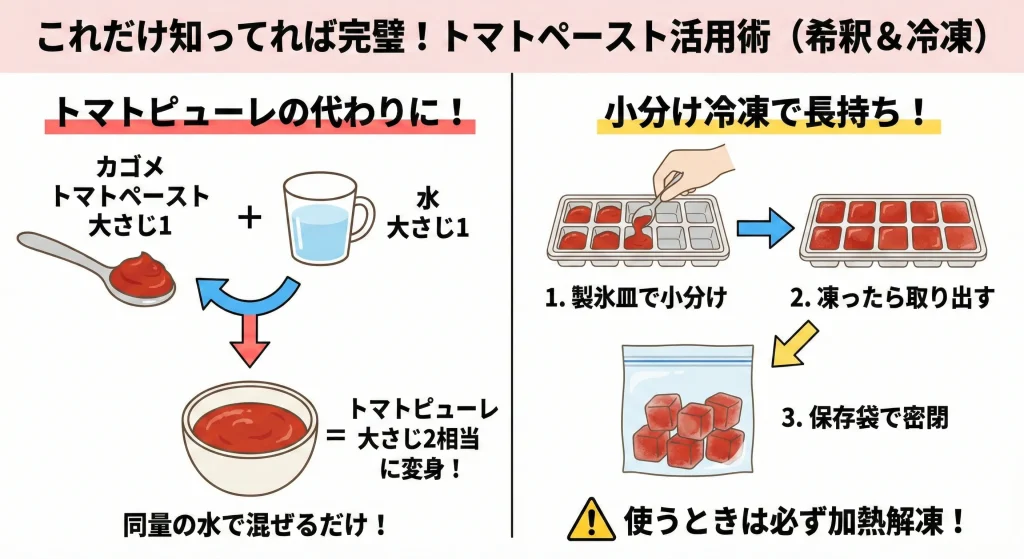 カゴメのトマトペースト(ミニパックなど)は、少量とはいえ離乳食一回分としては多すぎることがあります。保存料不使用のため、開封した瞬間から酸化と劣化が始まります。冷蔵保存では2日程度しか持たないため、開封後すぐに使わない分は「即、小分け冷凍」するのが鉄則です。これにより、一週間程度は新鮮な状態で使い続けることができます。