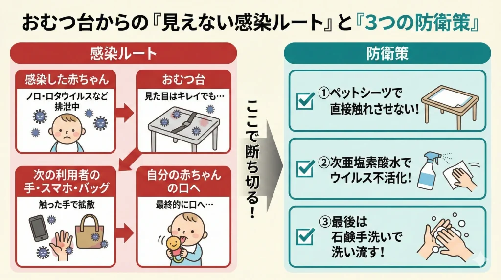 また、ヘルパンギーナや手足口病の原因となるウイルスも非常に強力です。これらの感染症は、発熱や喉の痛みといった「目に見える症状」が消えたあとも、便の中には数週間、長ければ1ヶ月以上もウイルスが排出され続けます。お出かけしている赤ちゃんが「もう元気だから大丈夫」に見えても、実はおむつの中にはウイルスが潜んでいるというケースは珍しくありません。この「無自覚な排出」が公共のおむつ台で行われることで、気づかないうちにウイルスが広まってしまう「ステルス汚染」が発生しやすいんです。