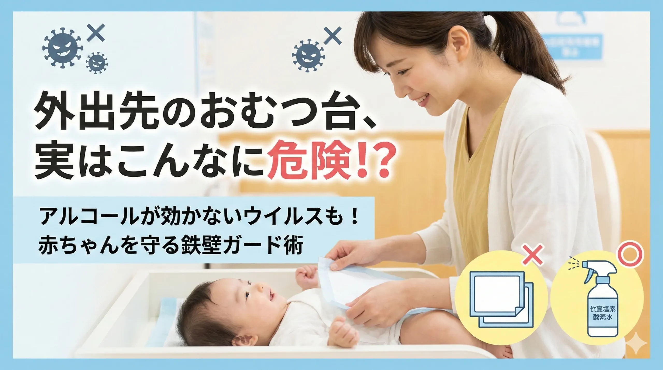 多くのパパ・ママがおむつ台を使う前にアルコールでシュッシュと拭いているのを見かけますが、残念ながらそれだけでは不十分なケースが多いです。もちろん、全く意味がないわけではありませんが、おむつ台で最も警戒すべき「お腹の風邪」系のウイルスに対しては、別の対策が必要になります。厚生労働省のガイドラインでも、ノロウイルス対策には次亜塩素酸ナトリウム(塩素系漂白剤の主成分)などを用いた消毒が推奨されています。 (出典:厚生労働省「ノロウイルスに関するQ&A」