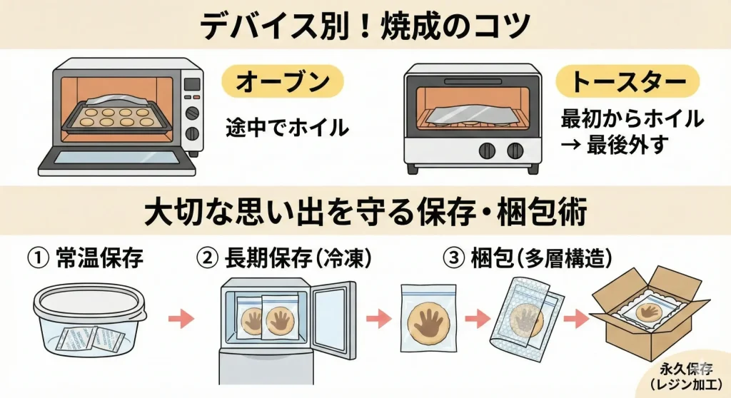 無事に可愛い手形が取れたら、次はそれを「永遠」にするための工程です。火の通し方から、大切な思い出を壊さないための保存術まで、しっかりチェックしていきましょう。