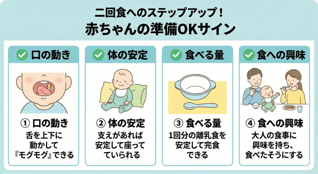 離乳食を一日のうち二回に増やすタイミングは、単に月齢だけで決めるのではなく、赤ちゃんの身体的な準備が整っているかどうかを総合的に判断することが大切です。ここでは、移行の目安となるサインや、なぜその時期が重要なのかについて、詳しく紐解いていきましょう。