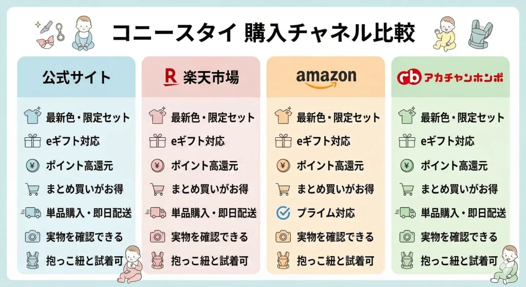 せっかく買うなら、感謝祭のようなセール時期を狙ってお得に手に入れたいものですし、最近増えているという偽物を掴まされないための注意点も知っておきたいですよね。この記事では、私が個人的に調べたコニースタイの販売状況や、どこで買うのが一番賢いのかという情報を整理してまとめました。これを読めば、皆さんの育児ライフにぴったりの購入先がきっと見つかるはずですよ。