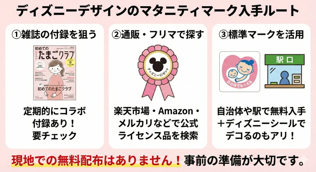 SNSなどで「ディズニーでマタニティマークをもらった」という投稿を見かけることがありますが、それは過去の期間限定イベントだったり、雑誌の付録を付けている様子だったりすることがほとんどです。現地でもらえる場所は現在ありませんので、事前の自力入手が基本となります。
